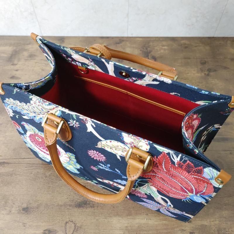 18世紀フランス伝統の「トワル・ド・ジュイ」生地を贅沢に使用した、A4対応の上質ハンドメイドバッグです。自然な軽さと美しいフォルムを両立し、通勤からお出かけまで幅広いシーンで活躍します。